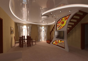 Подвесные конструкции позволяют реализовать любые дизайнерские идеи, создать зонированное освещение и выполнять ряд других функций. Потолки могут быть одноуровневыми, двухъярусными и трехъярусными. Возможен выбор пленки различных цветов, а также нанесение рисунков или аэрографии по индивидуальному заказу.